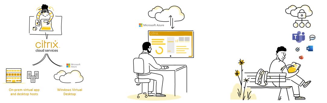 A modern digital workspace is built on solutions from Citrix and Microsoft, including Microsoft Windows Virtual Desktop, the Citrix Virtual apps and Desktop Service, and Citrix Workspace.