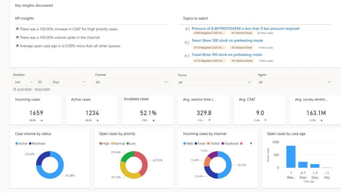Dynamics 365 Customer Service Insights helps both agents and customer service managers make better decisions and proactively improve customer satisfaction by using artificial intelligence (AI) and analytics capabilities for Customer Service and Omnichannel. You can empower your teams with insights into customer satisfaction–boosting analytics and AI-powered features to spend less time searching and more time engaging with customers.