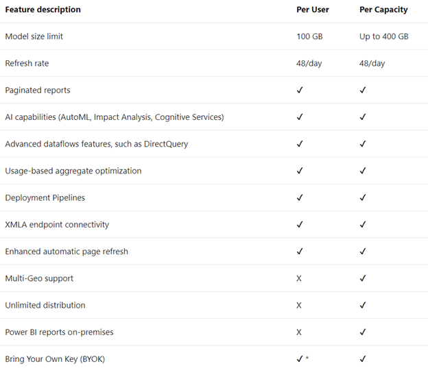 The following table describes the Premium Per User (PPU) features against a Premium capacity: