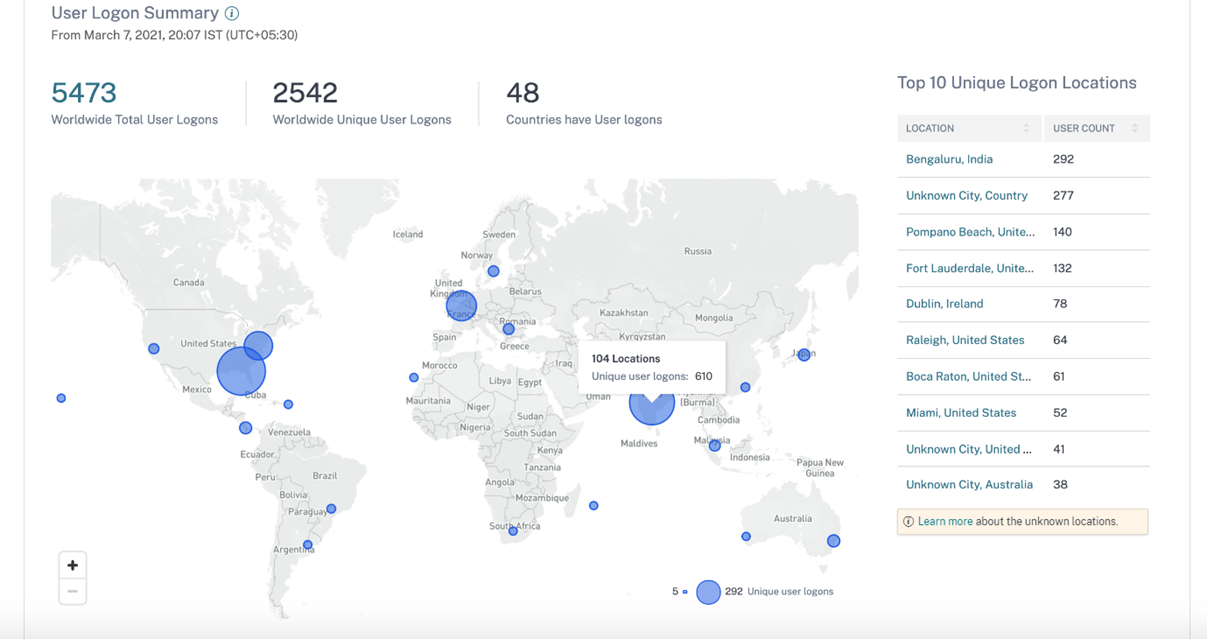 With the increase in remote work, it’s become more important than ever to understand the locations from which users access Citrix resources. The Access Assurance dashboard, now in preview, can help admins visualize access requests. The dashboard provides the total number of logons, unique users, number of countries with logins, and more. If administrators detect access requests from unauthorized locations, they can implement the newly-released geofencing capability to deny all requests from those locations.